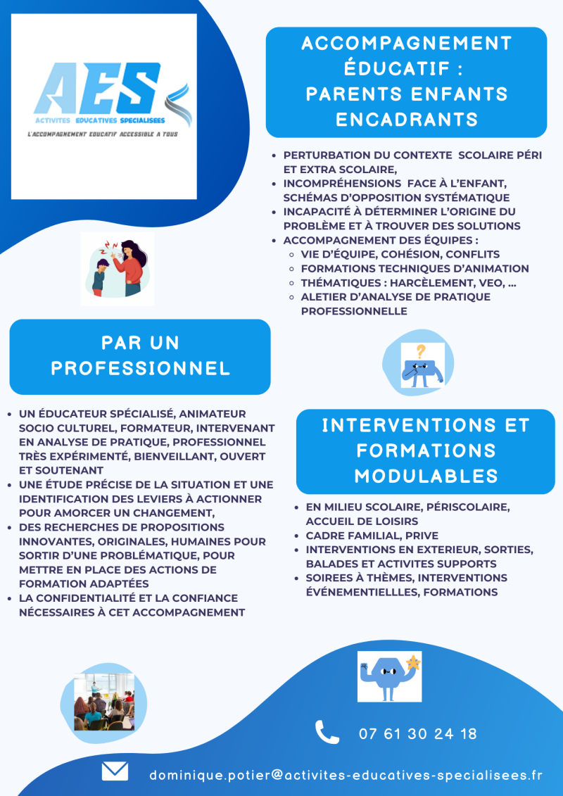 Si vous avez besoin de ressources supplémentaires, complémentaires, c’est là que je suis à même d’intervenir pour soutenir, parents, enfants, familles, adultes, professionnels de l’animation et de l’éducation. Se réunir et échanger est essentiel pour tous, autour de dynamiques positives et constructives, d’analyse de pratique et de recherche de solutions, ensemble.